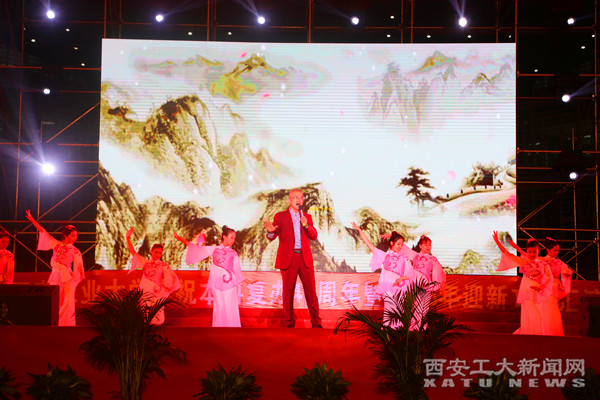 充满激情与活力的歌舞《重返十七岁》为晚会拉开了序幕。校友张涛、胡宁、段明亮分别与我校师生共同表演的歌曲《历史的天空》,《共和国之恋》和书法表演《水墨丹青》用余音绕梁的歌声、遒劲有力的笔锋为庆祝学校复办四十周年送上祝福。