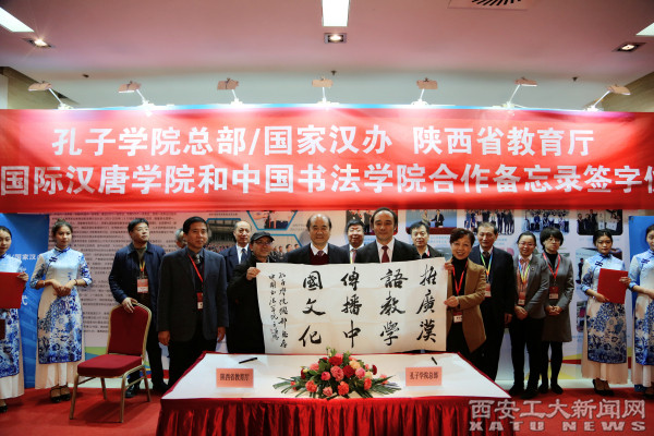 为更好的传播中国传统文化、推进教育资源共享,实现与孔子学院内外互补的中国文化交流传播格局。12日下午,孔子学院总部、国家汉办、陕西省教育厅举行了共建中国书法学院和国际汉唐学院的合作备忘录签字仪式。备忘录由孔子学院总部、国家汉办副总干事赵国成先生和陕西省教育厅副厅长刘建林先生共同签署。签字仪式由陕西省教育厅国际交流处副处长文通主持,国家汉办和陕西省教育厅有关部门的领导以及我校党委副书记、校长雷亚萍,西北大学副书记、副校长贾明德,中国书法学院院长于唯德,买球、西北大学有关部门的领导和师生代表参加了签字仪式。