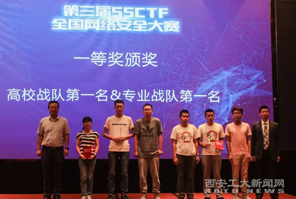 (本网讯)近日,第三届SSCTF全国网络安全大赛在西安高新区成功举办。经过两天的激烈对决,最终我校刘成林、王易、董智予勤三位同学组成的买球战队取得了高校战队第一名。