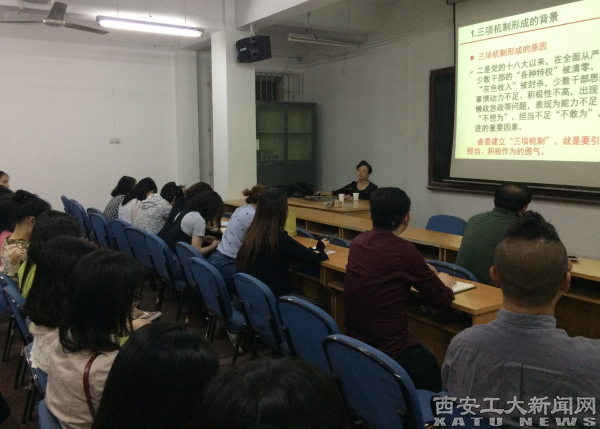 雷亚萍围绕“三项机制”的形成背景、陕西省委“三项机制”的内容、我校“三项机制”的制定以及具体内容的解读做了详细讲解。雷亚萍重点解读了《买球领导人员鼓励激励、容错纠错、能上能下实施细则(试行)》的内容。从鼓励激励、容错纠错和能上能下的具体情形入手,结合实际进行讲解、释疑。党课内容丰富,深入浅出,达到了良好效果。