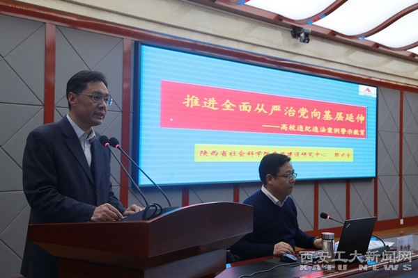(本网讯)11月8日,学校召开“以案促改”警示教育大会,会议邀请省社会科学院政治与法律研究所所长、廉政建设研究中心主任郭兴全作了《推进全面从严治党向基层延伸——高校违纪违法案例警示教育》的专题报告。会议由纪委书记郑建山主持。