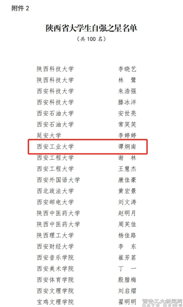 (本网讯)近日,由共青团陕西省委、陕西省学生联合会举办的2023-2024年度“陕西省大学生自强之星”寻访结果正式揭晓,我校电子信息工程学院“军民装备信息感知与智能控制”科创团队荣获“陕西省大学生自强之星科创团体”称号。机电工程学院2020级本科生谭炯南荣获“陕西省大学生自强之星”称号。