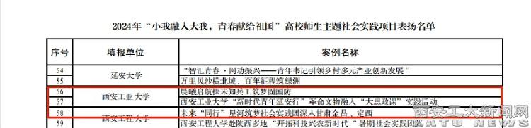 (本网讯)我校2个社会实践项目入选陕西省2024年“小我融入大我,青春献给祖国”高校师生主题社会实践遴选的100个项目中。