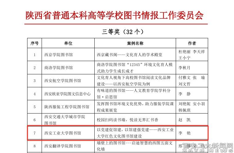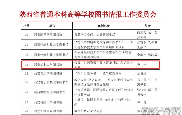 (本网讯)近日,由陕西高校图工委举办的“陕西高校图书馆环境文化建设案例征集与评选活动”揭晓,我校图书馆申报的两个案例《以党建促馆建,以馆建强党建——买球红色文化图书馆建设》、《构建“以阅敦德”育人体系 提升大学生人文素养》均喜获三等奖。