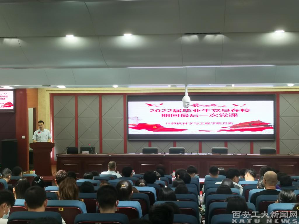 (本网讯)6月22日,计算机学院党委在未央校区学术报告厅举行2022届毕业生党员“大学里的最后一次党课”主题活动,邀请党委组织部常务副部长、党校副校长梁闪慧同志为毕业生党员讲授党课。计算机科学与工程学院全体2022届毕业生党员,学院党委领导,学生党支部书记参加活动,活动由学院党委副书记靳永军主持。