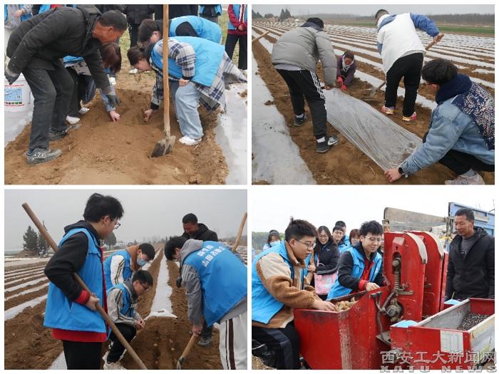 在当地农民的带领下青年大学生走入田间地头,同学们主动了解土壤特点、土豆选种、播种方法以及机器运作知识。大家对机器播种兴趣浓厚,争相体验耕作机的操作使用,协助当地农户完成了土豆种的人工筛选,切身感受到了科技助农的魅力。同学们跟随农户从犁地、放种到铺膜进行分步学习演示,分组帮助农户进行田间种植。大家分工明确、相互协作,在农户的帮助指导下,历时1个多小时完成了一亩地的土豆播种。全过程大学生们体验着劳动的艰辛和快乐,在劳动中提能力、长本领、受教育。
