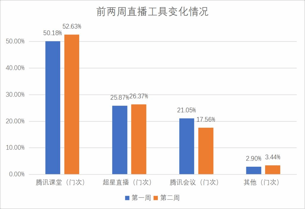 通过前期的问题反馈,教师对线上教学工具进行了优化,从本周教师线上直播教学工具的使用情况来看,腾讯课堂和超星直播有所增加,腾讯会议有所减少,具体情况如下: