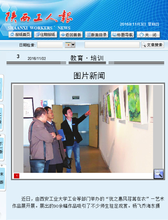 近日,由买球工会等部门举办的“犹之惠风荏苒在衣”—艺术作品展开展。展出的90余幅作品吸引了不少师生驻足观赏。杨飞乔海东摄(《陕西工人报》2016年11月3日第三版)