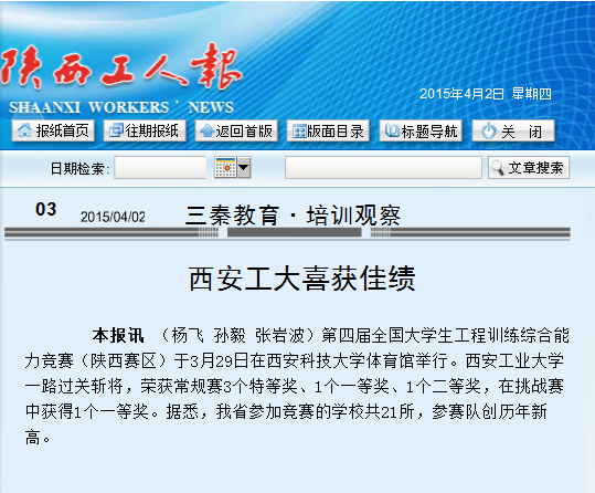 本报讯 (杨飞 孙毅 张岩波)第四届全国大学生工程训练综合能力竞赛(陕西赛区)于3月29日在西安科技大学体育馆举行。买球一路过关斩将,荣获常规赛3个特等奖、1个一等奖、1个二等奖,在挑战赛中获得1个一等奖。据悉,我省参加竞赛的学校共21所,参赛队创历年新高。